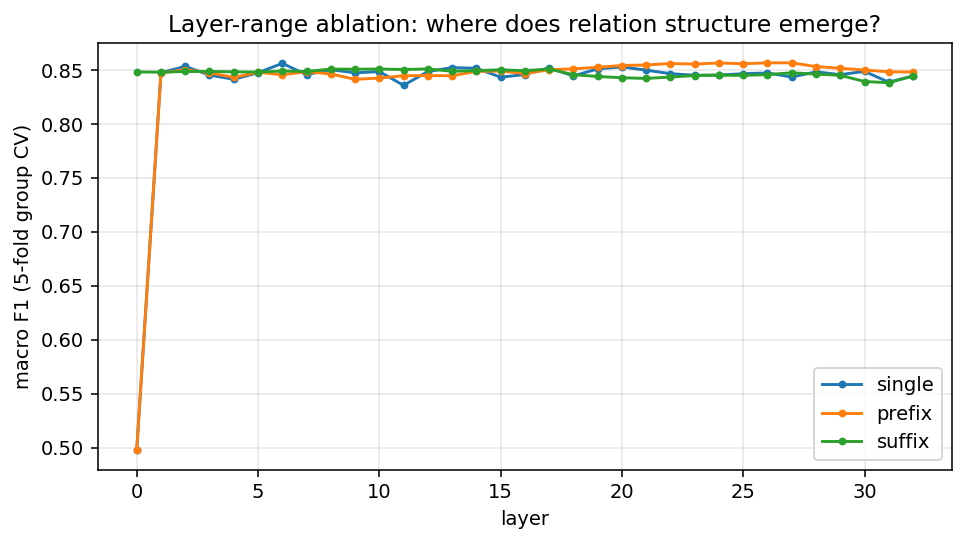 rename ≈ domain >> role_swap; a token-based encoding predicts the opposite. - P3 — Relation decoder. L2-regularized logistic regression decoding operator-position relation type (perimeter-eq vs. area-eq vs. bound for farmer; kinematic-eq vs. sqrt-form for ball) per layer, using 5-fold GroupKFold by paraphrase to block idiom leakage. Reports macro-F1.