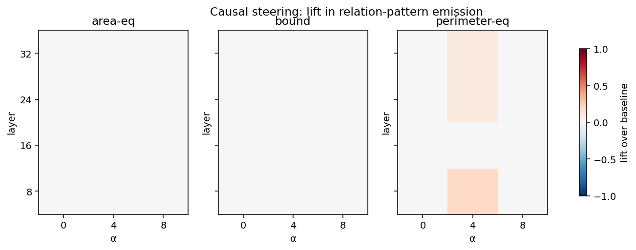 Causal steering intervention at layer 8 (α = 4) lifts perimeter-equation emission from 0 / 20 to 4 / 20 — a real but partial causal handle. Steering at layer 16 produces no behavioral effect — a “dead zone” where the relation-structure signal is present but no longer consumed downstream.