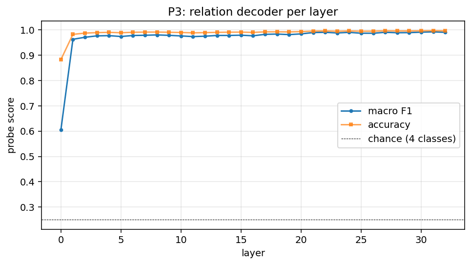 | Relation collapse | P3 F1 drops on incorrect | within 0.03 — rejected |